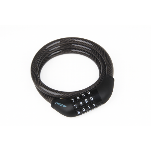 Linga o cable de seguridad reforzado de la marca Philco, modelo PLS45VE1P, diseñado para proteger bicicletas, herramientas, equipamiento y otros objetos valiosos con un sistema de cierre mediante combinación numérica de 4 dígitos. Su diseño flexible y resistente ofrece seguridad práctica para uso diario.