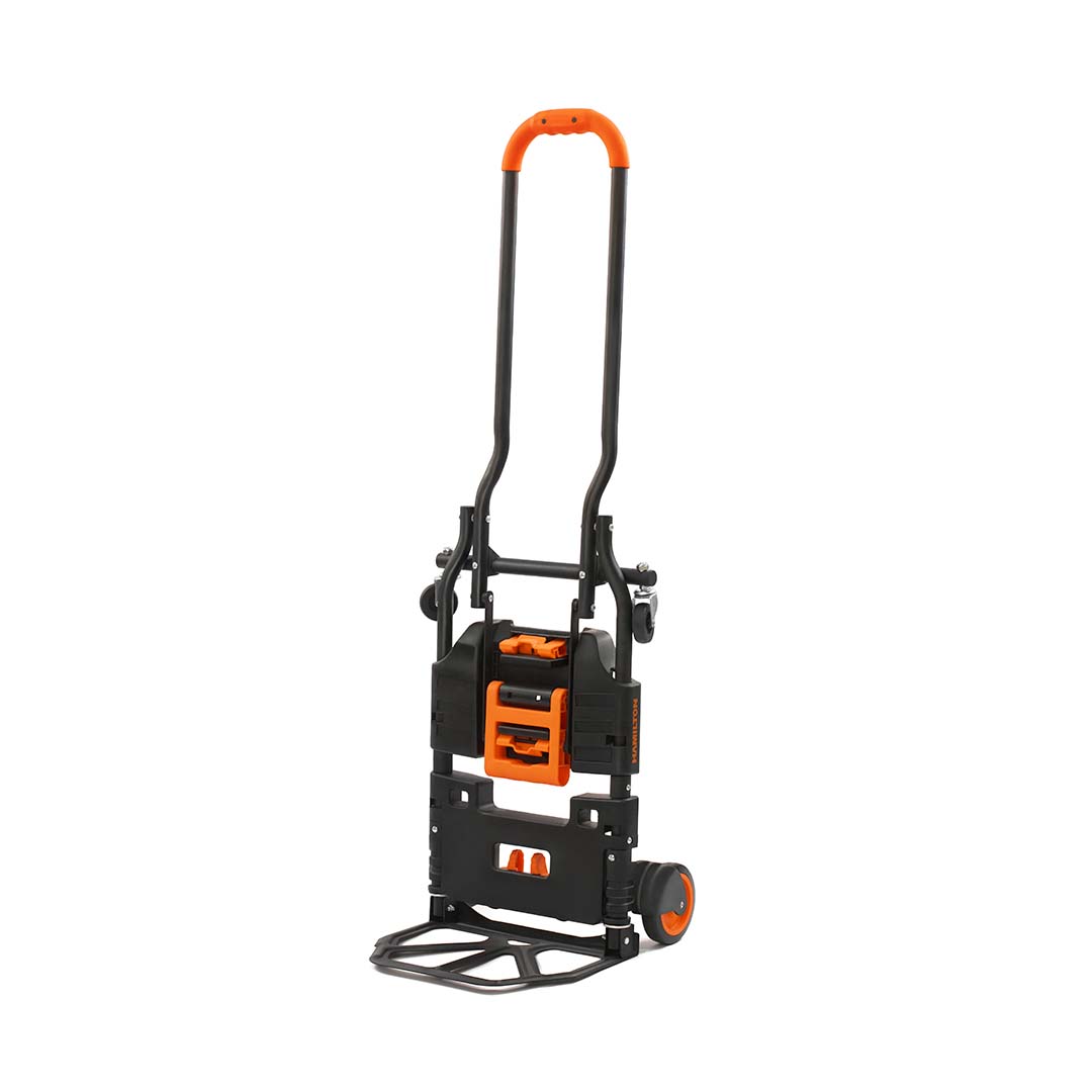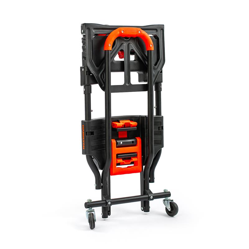 Carro de carga multifunción de la marca Hamilton, diseñado para facilitar el transporte de materiales en talleres, depósitos y uso doméstico. Su sistema 2 en 1 permite utilizarlo tanto en formato vertical como carro de plataforma, adaptándose a diferentes necesidades de carga.
