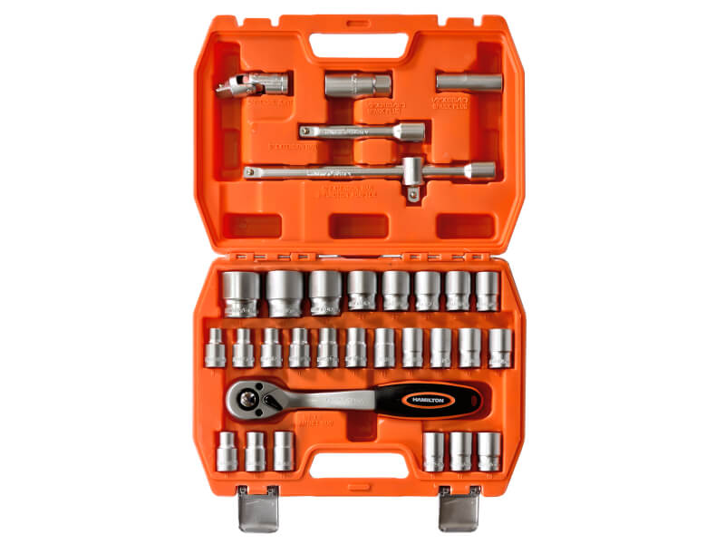 El Juego de Bocallaves y Accesorios Hamilton JB12 ofrece versatilidad y robustez en un solo set de 32 piezas milimétricas, ideal para trabajos mecánicos, mantenimiento e industria. Forjado en acero cromo-vanadio y fabricado bajo normas DIN3120, garantiza durabilidad, precisión y un acople seguro en cada aplicación.
