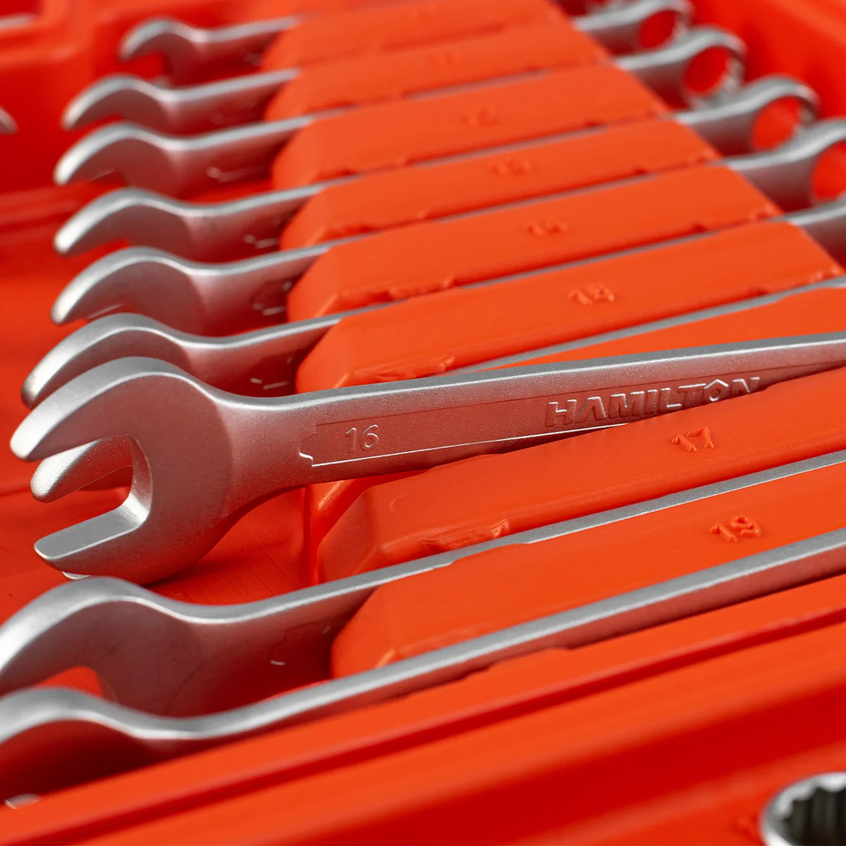 • 12 Llaves Combinadas Milimétricas: 8 · 10 · 11 · 12 · 13 · 14 · 15 · 16 · 17 · 19 mm.