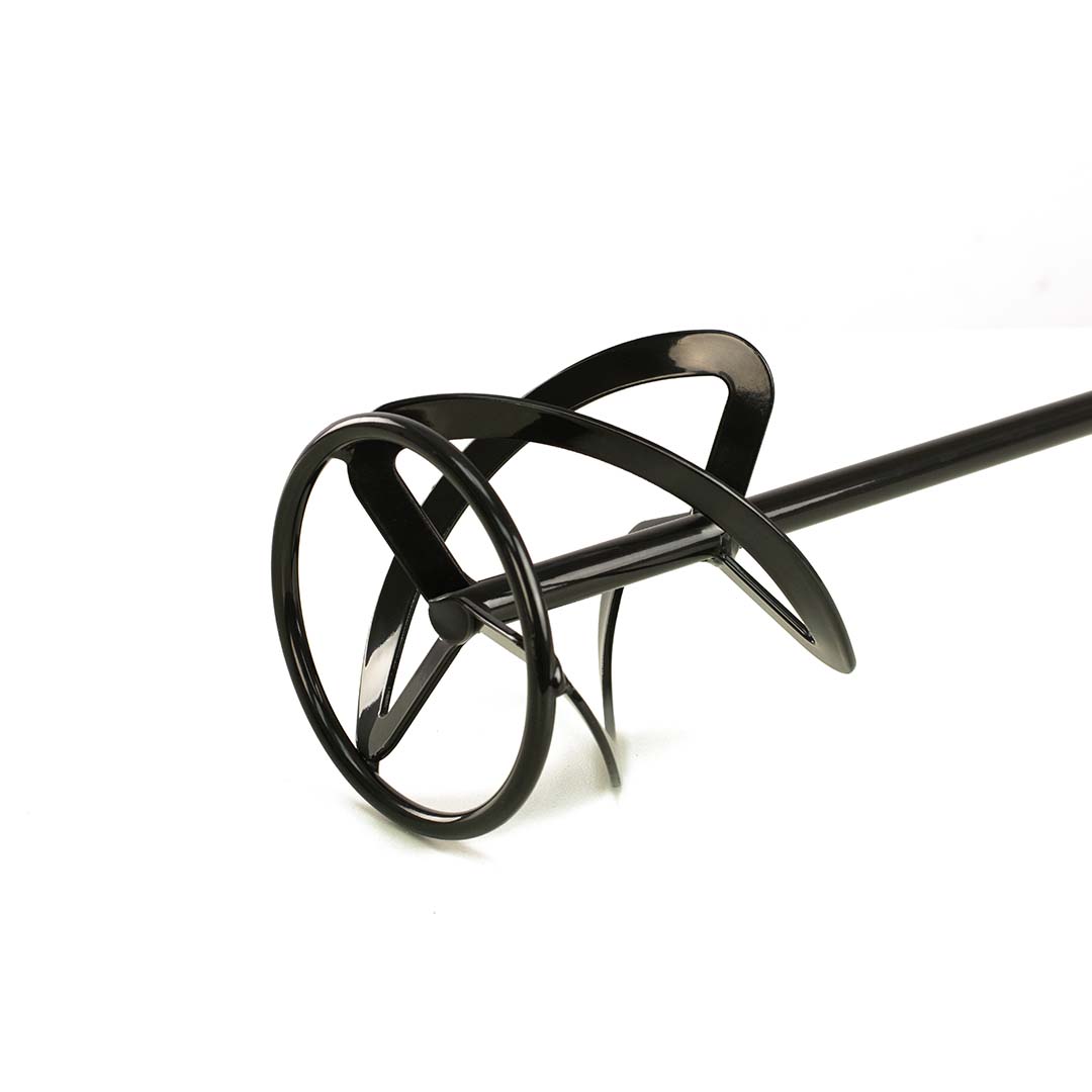 Varilla helicoidal de doble hélice con aro metálico para mezcladores, diseñada para lograr mezclas homogéneas de materiales como pintura, cemento, adhesivos y morteros. Compatible con herramientas eléctricas con rosca M14, ideal para profesionales de la construcción, obra o bricolaje que requieren agitación eficaz y uniforme.