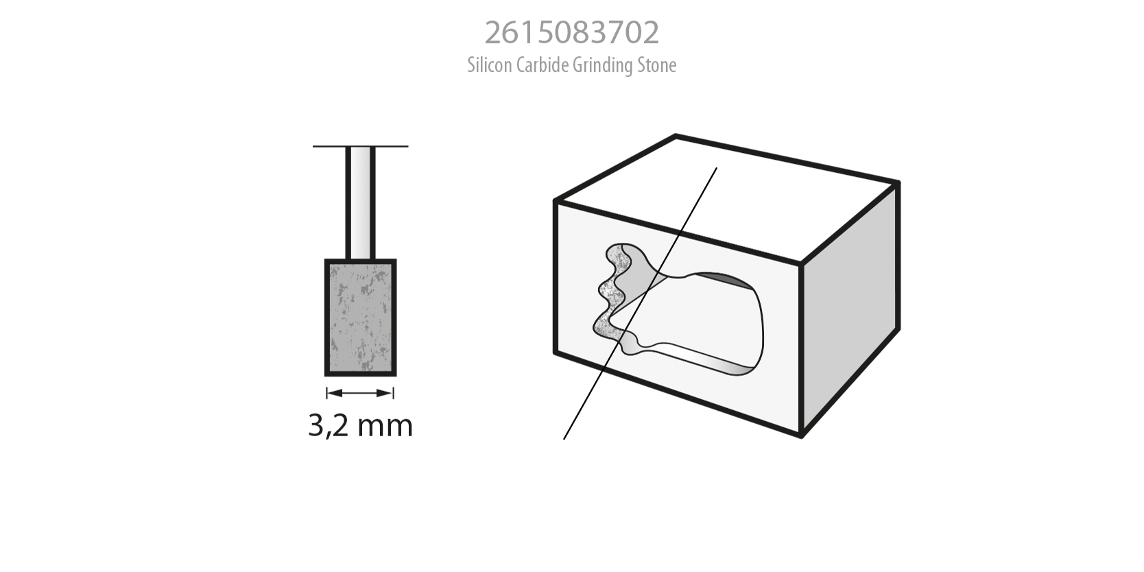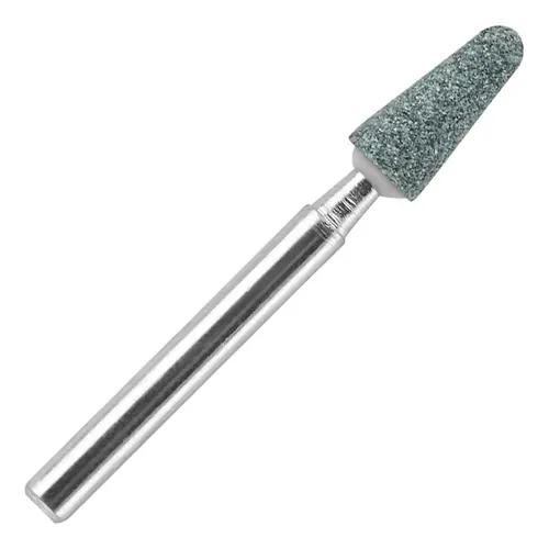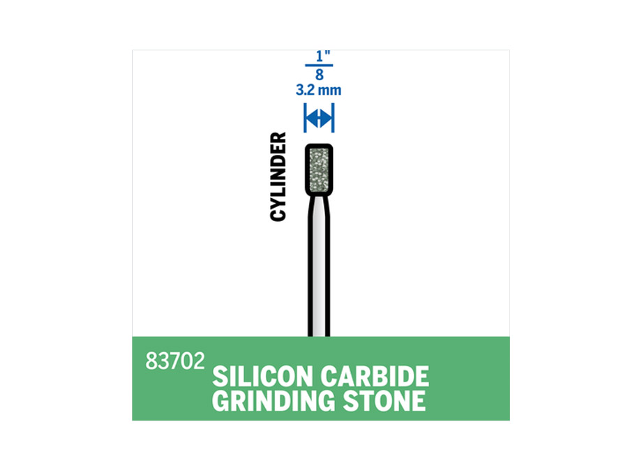 Punta abrasiva de carburo de silicio Dremel 83702, diseñada para amolado, desbaste, contorneado y perfilado en materiales duros y difíciles, utilizando herramientas rotativas tipo minitorno. Su forma permite acceso a superficies planas y curvas con precisión.