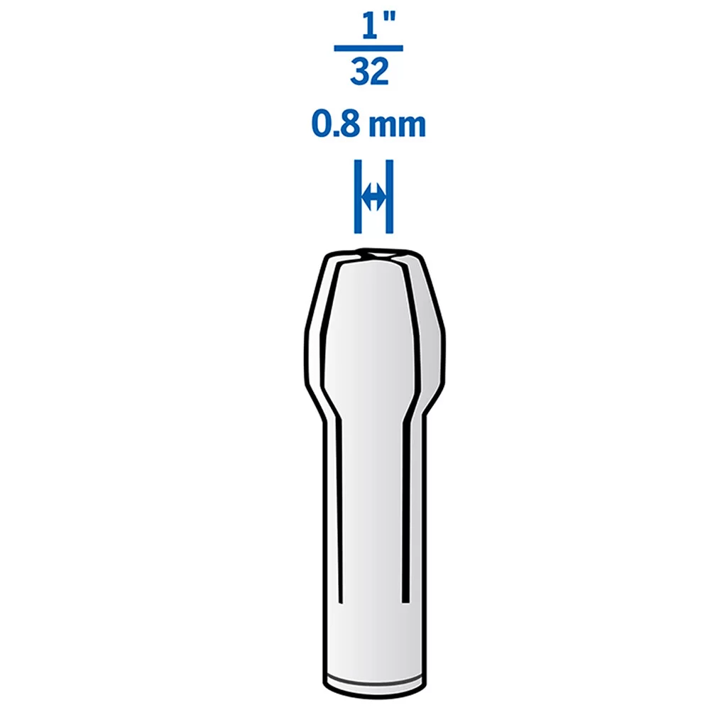 Pinza (boquilla / collet) Dremel diseñada para sujetar accesorios con vástago de 0,8 mm en herramientas rotativas tipo minitorno. Ideal para trabajos de máxima precisión donde se utilizan accesorios de diámetro muy fino.