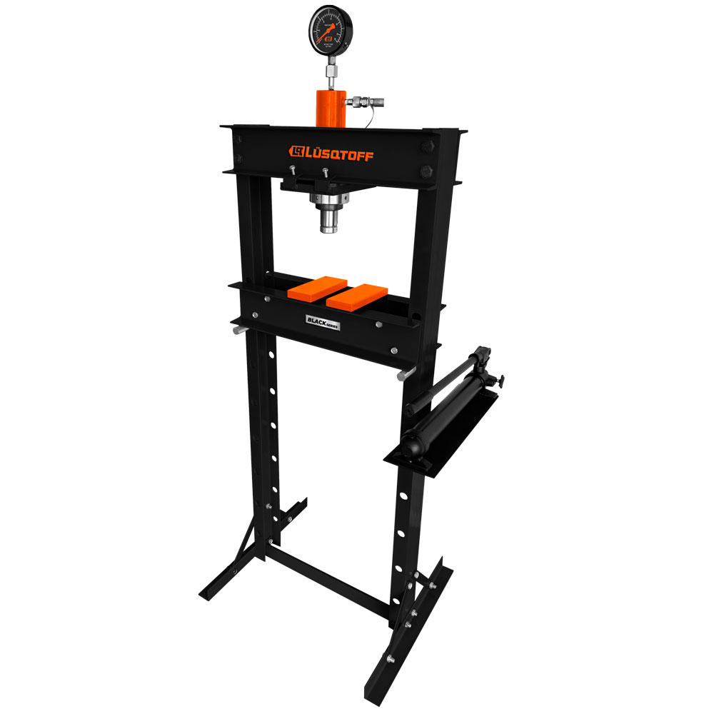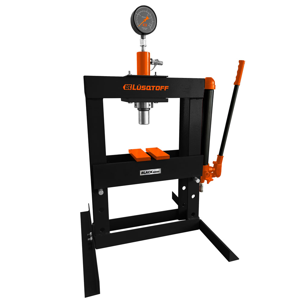 Prensa hidráulica de banco de la serie Black Series de la marca Lüsqtoff, diseñada para aplicaciones de taller y metalmecánica que requieren fuerza de compresión controlada. Ideal para tareas de armado, desarmado, doblado o ajuste de piezas metálicas con una fuerza aplicada uniforme y potente.