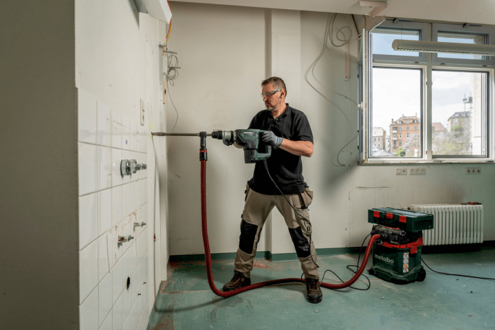 Martillo combinado profesional de la marca Metabo, diseñado para trabajos intensivos de perforación y demolición en hormigón. Equipado con sistema SDS Max y alta energía de impacto, es ideal para uso en obra exigente y trabajos pesados.