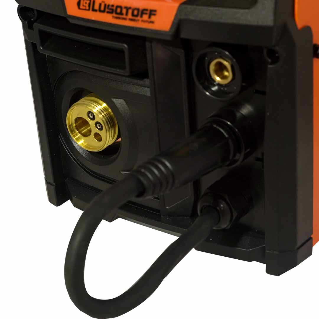 Soldadora inverter de la marca Lüsqtoff, modelo EVO MIG-220, diseñada para trabajar en procesos MIG (alambre con o sin gas) y MMA (electrodos), con control digital y tecnología inverter para un rendimiento eficiente y versátil en aplicaciones de soldadura para talleres, mantenimiento y construcción.