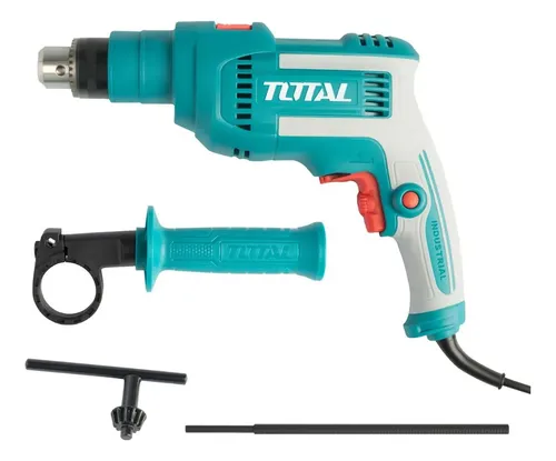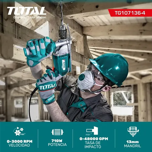 Taladro percutor eléctrico industrial de la marca Total Tools, modelo TG1071366-4, ideal para proyectos de construcción, mantenimiento y bricolaje. Su motor potente y su diseño robusto lo hacen apto para perforar madera, metal y mampostería con eficiencia y precisión.