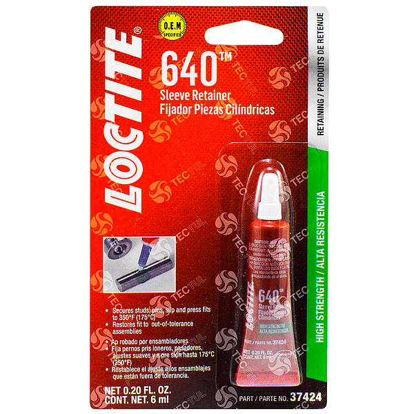 LOCTITE 640 está diseñado para la unión de componentes cilíndricos. El producto cura en ausencia de aire, entre superficies metálicas ajustadas, evitando el aflojamiento y las fugas producidas por impactos y/o vibraciones. Entre las aplicaciones típicas se incluye la retención de chavetas y ejes estriados, eliminando el cabeceo en montajes desgastados, la retención de rodamientos, evitando que se salgan, retención de rotores en ejes en motores síncronos y asíncronos, cojinetes de retención y manguitos en alojamientos y en ejes, aumento de montajes a presión, restauración de conexiones en montajes desgastados o en piezas fuera de tolerancia.